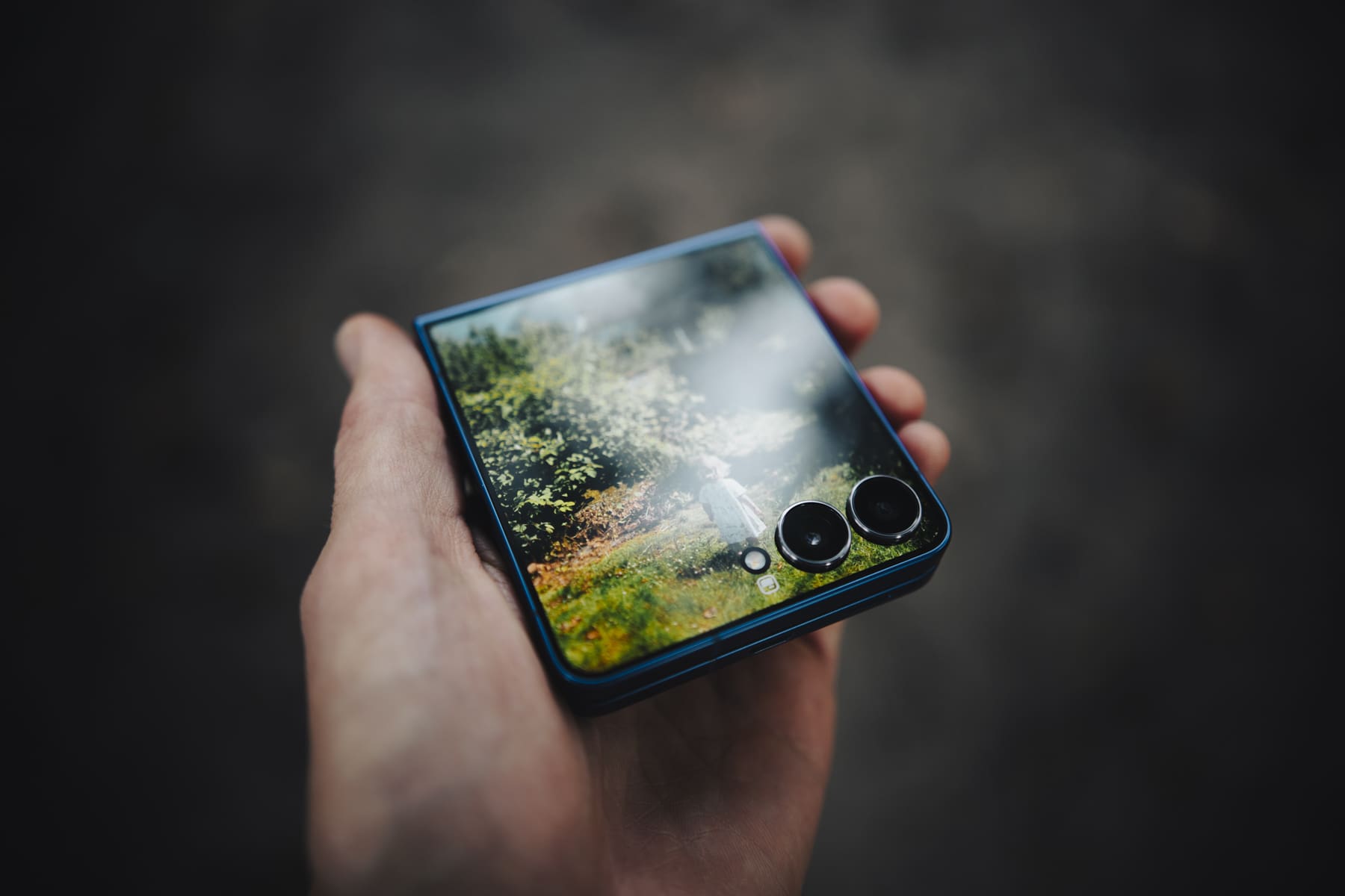 Den imponerende frontskjermen på Z Flip7 føyer seg tett rundt de to kameraene og gjør at nærmest hele fronten er dekket av skjerm. Oppløsningen er like skarp som på andre mobilskjermer med 120 Hz oppdateringsfrekvens. Dette er skjermen du bruker når du skal ta en selfie, sjekke varsler og svare på korte meldinger.