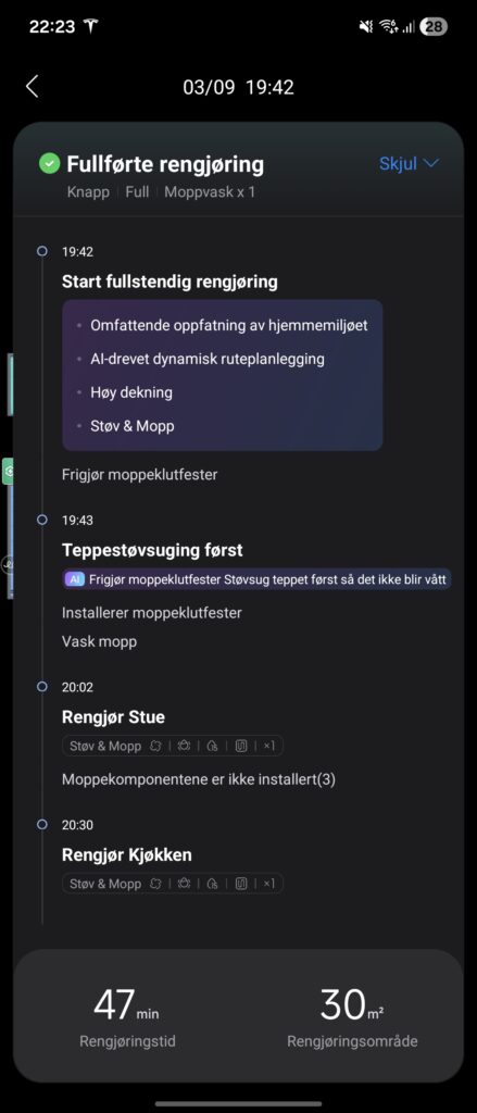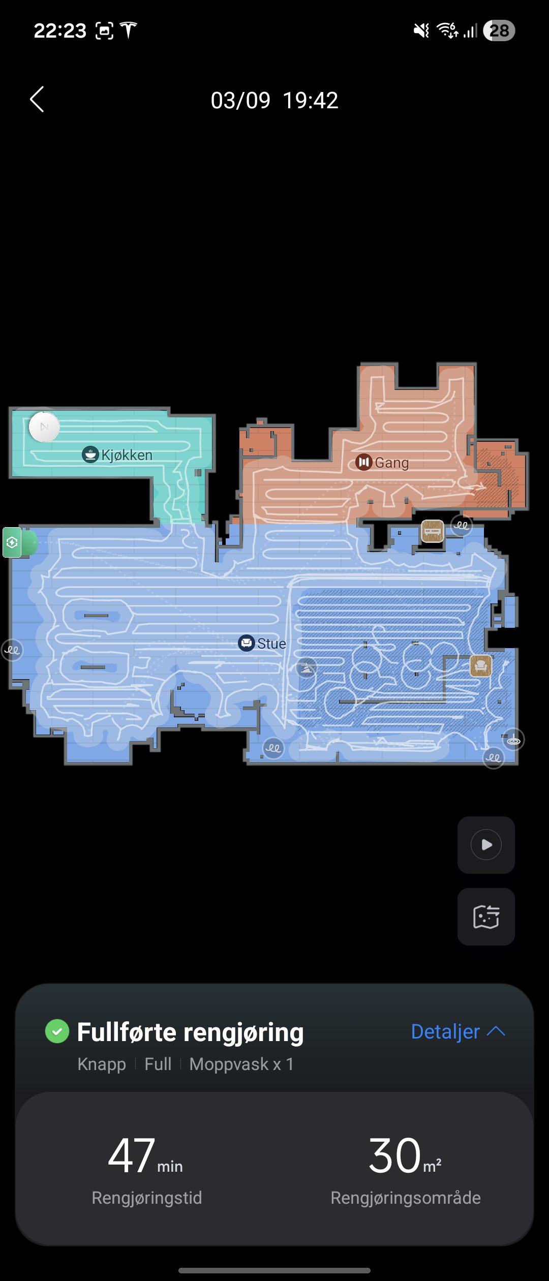 Den kjenner naturligvis igjen forskjellige romtyper og lager et kart som du senere kan justere i appen. Når den vasker og holder på, lager den en detaljert oversikt over hva den driver med. Den kjenner dessuten igjen kjæledyr og kan stilles inn til automatisk å ta bilder av de firbente, som du senere kan lagre og dele. Jeg har ingen firbente. Gudskjelov.