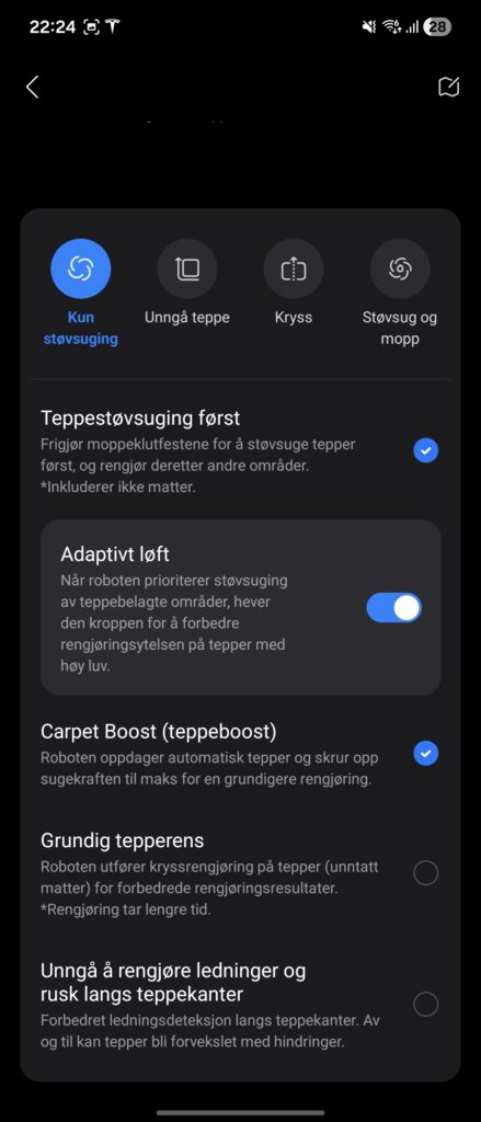 Roboten har også en egen modus for dyp rengjøring av tepper, der børsten justerer seg i en litt annen posisjon. Denne funksjonenen aktiveres i appen. Selv har jeg et stort persisk teppe i stuen som støvsugeren får bryne seg på. Og jeg kan ikke melde om annet enn at det blir veldig rent og pent.