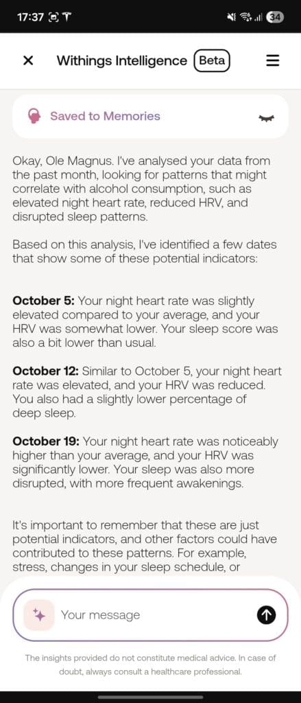 Et abonnement på Withings gir noen fiffige tilganger. Selskapet har integrert kunstig intelligens på en måte som jeg foreløpig ikke har sett i andre helseapper. Appen har fått en samtalerobot som du kan spørre om hva som helst knyttet til din egen helsen. Den har tilgang til alle dataene i appen og kan gjøre analyser og forklare deg hva som skjer med kroppen.