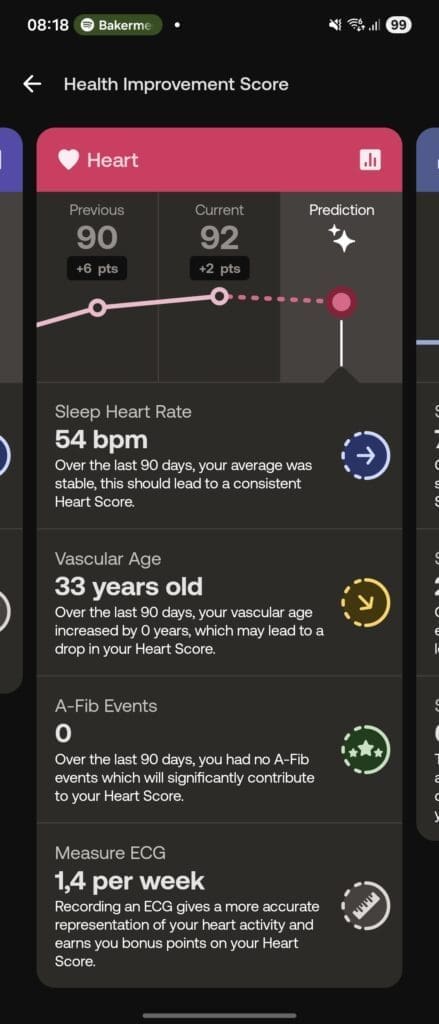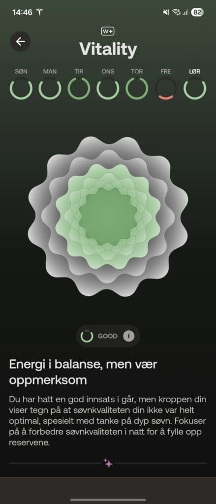 Withings+ gir deg en vitalitets-score basert på søvn og tidligere aktivitet. Og Withings er gode på å forklare. I appen får du oversikt over hva nivåene fra minimal til ekselent egentlig betyr. Dessverre kan man ikke bla seg tilbake å se tidligere dagers vitalitetsscore. Appen gir deg også en helsescore som lager et estimat ut fra alle dataen appen har tilgang på. Dette er en mer langsiktig gjennomsnittsmåling som kan endre seg litt fra uke til uke.