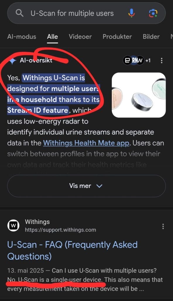 Apropos det. Da jeg søkte opp hvorvidt man kan dele på Withings U-Scan ble jeg vitne til Googles vanvittige ansvarsløse bidrag til spredning desinformasjon. Deres AI-oversikt skal man ikke stole på. Ofte har språkmodellen ikke snøring.