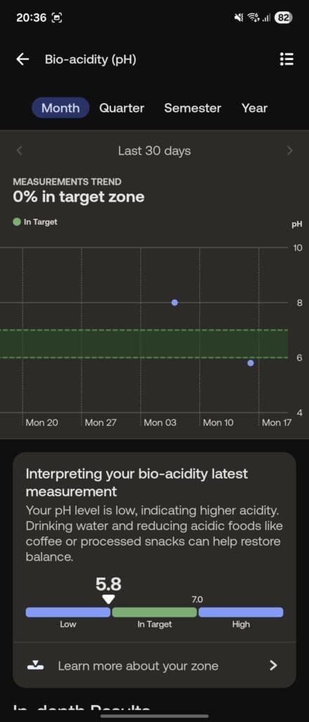 U-Scan måler også pH i urinen som varierer mye gjennom døgnet, og som egentlig ikke er en helseindikator ifølge fagfolk. Men det kan si noe om kostholdsendringer, hvor mye animalsk protein du spiser, og avsløre risiko for enkelte typer nyrestein. I mine målinger har jeg havnet rett utenfor det optimale området på begge sider. Uten at jeg tror det spiller noen særlig rolle.