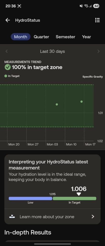Også væskebalanse kan gi mening å måle. Det er ikke perfekt, men det gir mening over tid, spesielt hvis du trener, faster eller spiser lite karbohydrater, U-Scan måler hvor mye som ikke er vann i urinen, og finner på den måten hvor hydrert man er. Ifølge appen har man god hydrering og en nyre som fungerer om man er innenfor sonen.